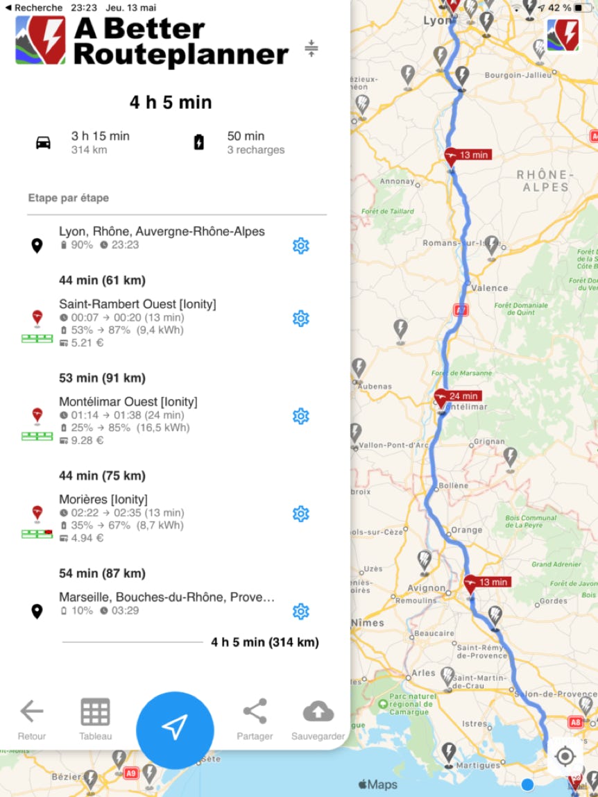 N’ayant pas de contraintes, j’ai décidé de tenter « l’aventure ». Pour bien me préparer j’ai utilisé l’application A Better Route Planner qui optimise les arrêts en calculant le meilleur endroit pour s’arrêter et le temps de charge optimal à chacun de ces arrêts pour arriver avec une autonomie de 10%. Ce paramètre reste d’ailleurs modifiable.