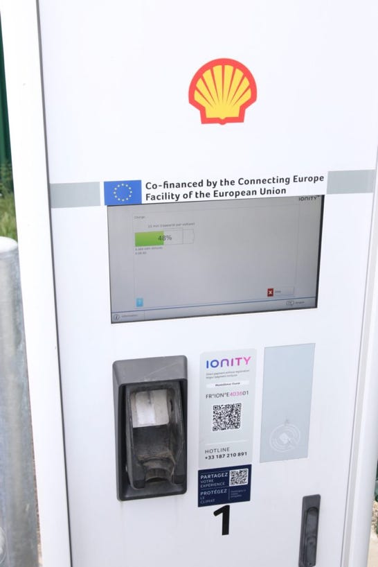 Les 20km en amont et en aval de Valence ont été très longs faisant perdre une heure sur le temps habituel. Là aussi la vitesse réduite et les arrêts/redémarrages ont été, je pense, favorables à l’autonomie. Quoi qu’il en soit, arrivé à la station de Montélimar, j’ai été agréablement surpris de constater qu’un seul des 5 chargeurs était occupé par une Volkswagen ID4. Je pouvais donc me garer immédiatement et commencer à charger.